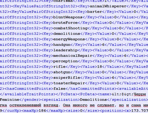 Во второй раз начал играть и понял что опять накосячил с атрибутами пришлось найти решение данной проблемы. Заходим в C:\Users\PC\Documents\My Games\Wasteland2\Save Games... с помощью Notepad++ открываем XML файл, в поиск вбиваем имя персонажа можно даже на русском (если рус версия) и получаем доступ к изменению всех характеристик, инвентарю, внешности, размеру модели. Я таким способом несколько схем атрибутов потестил, изменил внешний вид и хыры присоединяемых НПС. Медить сэйв можно не выходя из игры (alt+tab) перезагрузить мод сэйв. Удачи. Что то залез я в эти сейвы с помощью нотепад++. Ни хрена не понял. Смог найти имя Slik и всё на этом. Но даже в том что по данному имени открылось ни черта не понял где и что менять. |